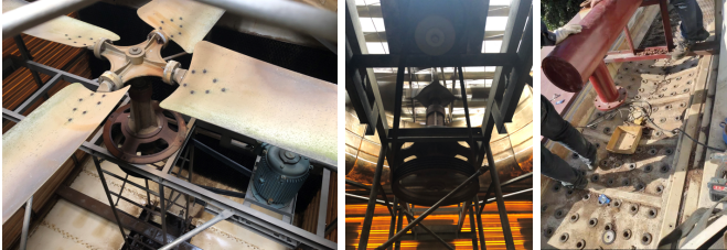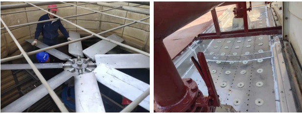 安裝新的冷卻塔超靜音風(fēng)機(jī),拆掉出風(fēng)口消聲器 更換新的冷卻塔不銹鋼接水盤